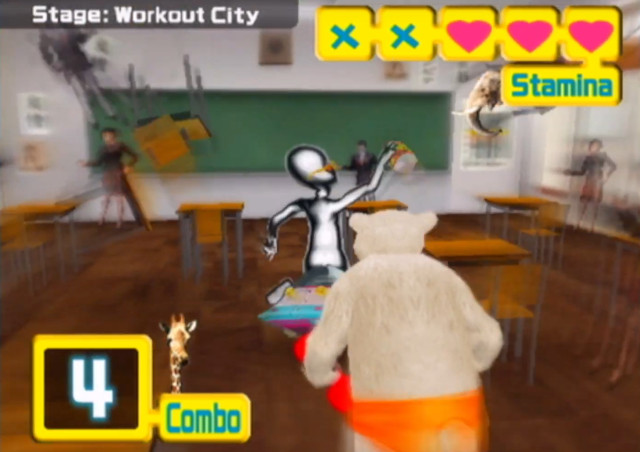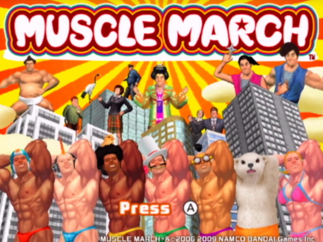 Muscle March is a Wii Ware action game that contains lots of strong, often times buff looking people and humanoids busting through walls and chasing each other down over stolen protein powder. It blessed the world with it's presence first in Japan on May 26th 2009. NA and PAL regions had to wait until early 2010 to experience it's glory. Originally meant to be released for arcades, Muscle March was shelved for who knows what. Fortunately for us, Namco decided to release it as Wii Ware which gave life to a game that otherwise would be lost to time.